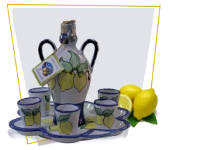 Handcrafted ceramics meets the unique taste of our limoncello. Many refined ideas, perfect to give as a gift, such as the complete sets of small glasses, tray and bottle of limoncello or the small ceramic amphorae decorated by hand.